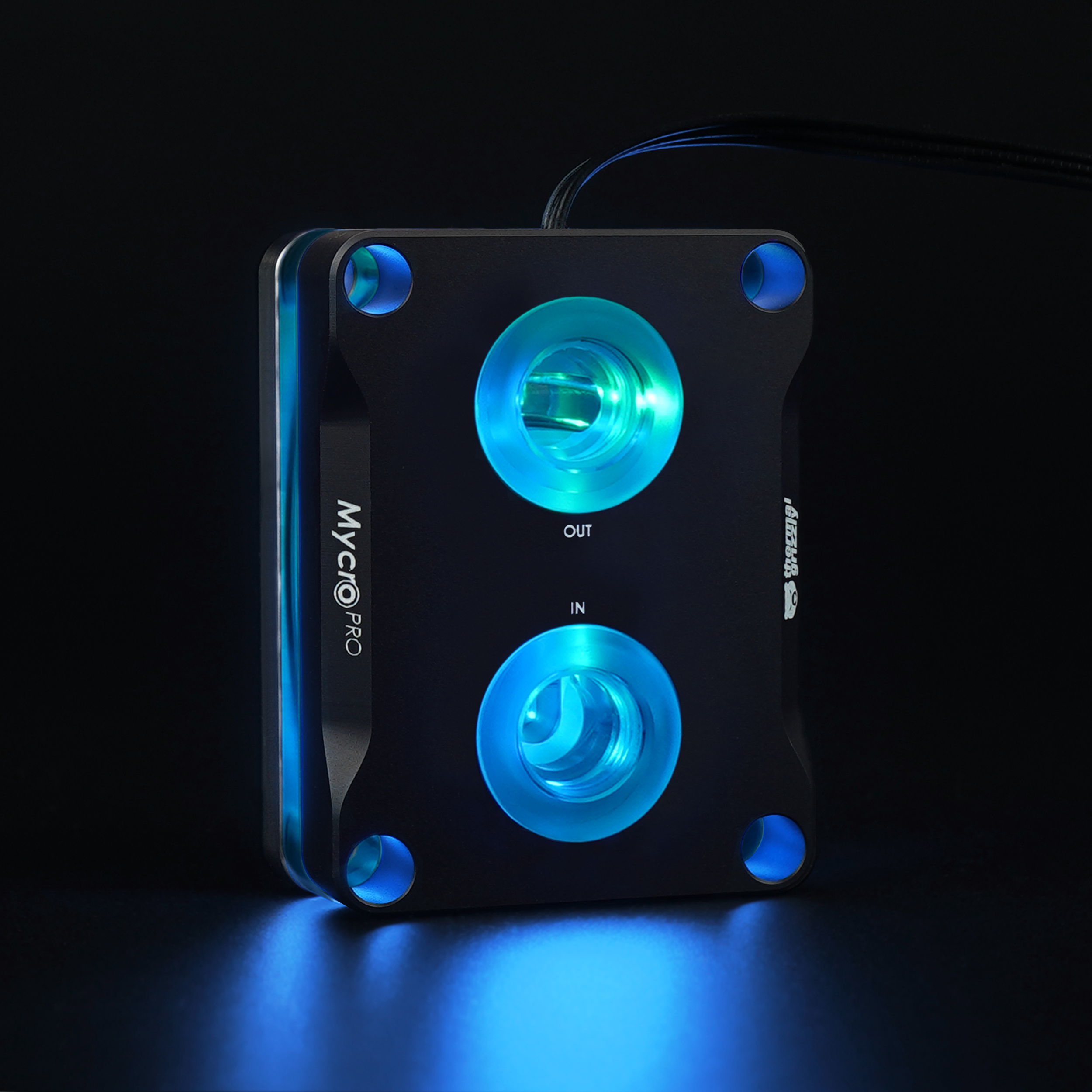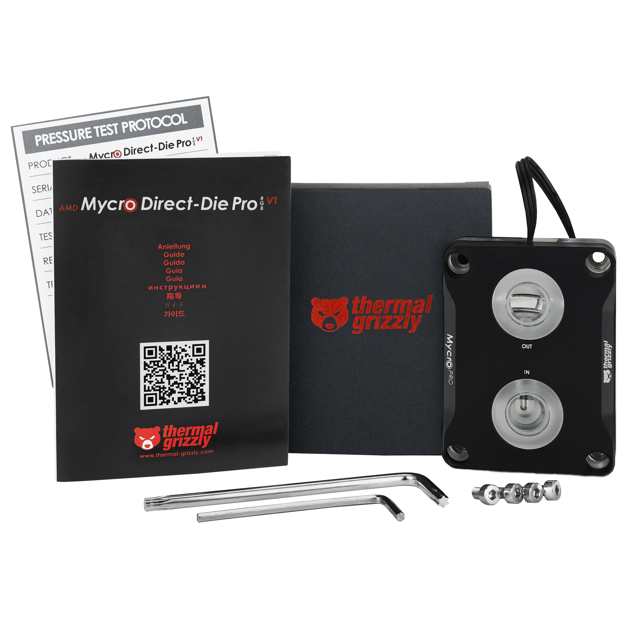 Der AMD Mycro Direct-Die Pro RGB V1 verfügt über eine Hybrid-Struktur mit zwei unterschiedlichen Größen der Mikrofinnen sowie eine Jetplate für einen optimierten Strömungsfluss. Die Coldplate des Kühlers besteht aus vernickeltem Kupfer und wird direkt auf dem Chip der CPU montiert. Hierfür wird der Socket Actuation Mechanism (SAM) des Mainboards entfernt, und der Prozessor muss geköpft werden. Das Vernickeln der Kühlerplatte erzeugt eine Sperrschicht, sodass Gallium-basiertes Flüssigmetall nicht in das Kupfer diffundieren kann und ein mehrmaliges Auftragen von Flüssigmetall in der Regel nicht notwendig ist.