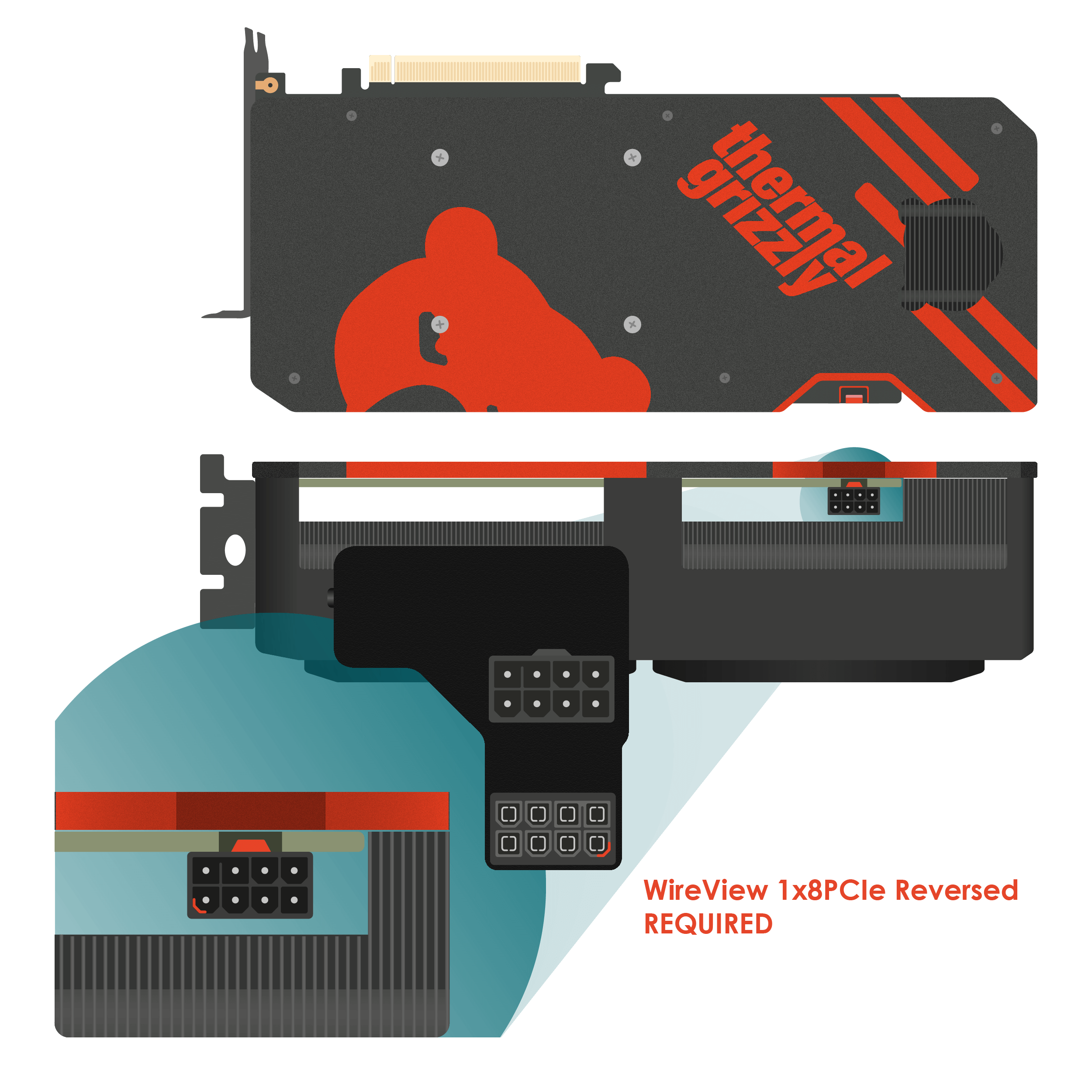 La GPU WireView está disponible en las versiones „N“ y „R“ independientemente del número de conectores PCIe de 8 patillas (o del conector 12VHPWR). „N“ significa la orientación normal del conector PCIe en la tarjeta de expansión PCIe, mientras que „R“ significa la orientación invertida. En la orientación normal (N), el clip de sujeción del conector apunta hacia fuera de la placa de circuito impreso de la tarjeta de expansión. En la orientación invertida (R), el clip de retención del conector apunta hacia la PCB.
