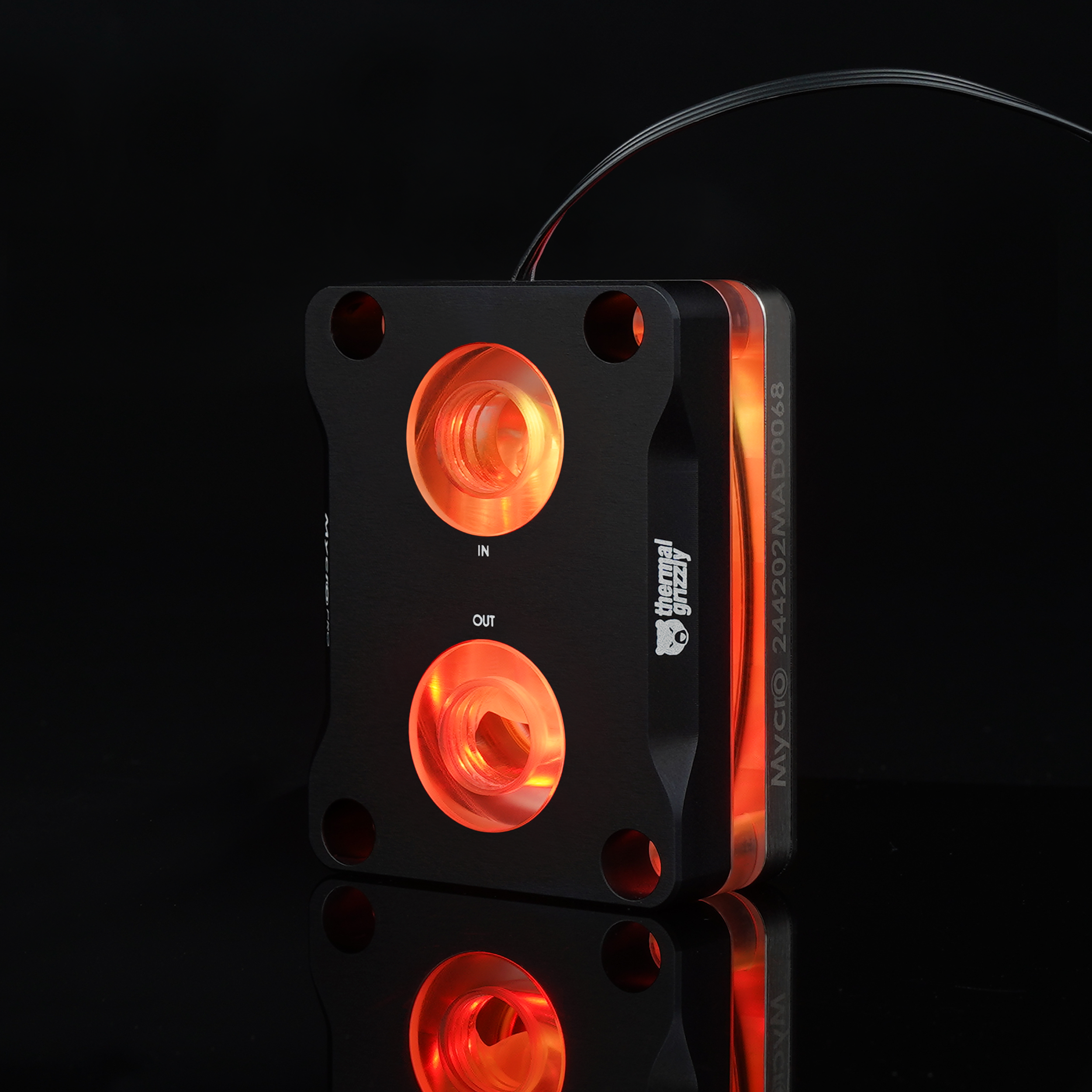 Zwischen der Coldplate und dem Deckel aus eloxiertem Aluminium befindet sich Acyrlglas, das nach dem Fräsen einem Temperprozess unterzogen wird, welcher das Acrylglas von inneren Spannungen befreit. Dadurch kann sichergestellt werden, dass sich auch nach einer langen Nutzungsdauer keine Spannungsrisse im Acrylglas bilden, wie es bei gehärtetem Acrylglas vorkommen kann. Unter dem Alu-Deckel befinden sich RGB-LEDs, die via 3-Pin-ARGB-Header (+5V/DATA/GND) über das Mainboard gesteuert werden. Die LEDs beleuchten das Acrylglas unter dem Deckel und die G1/4-Zoll-Anschlüsse im Deckel.