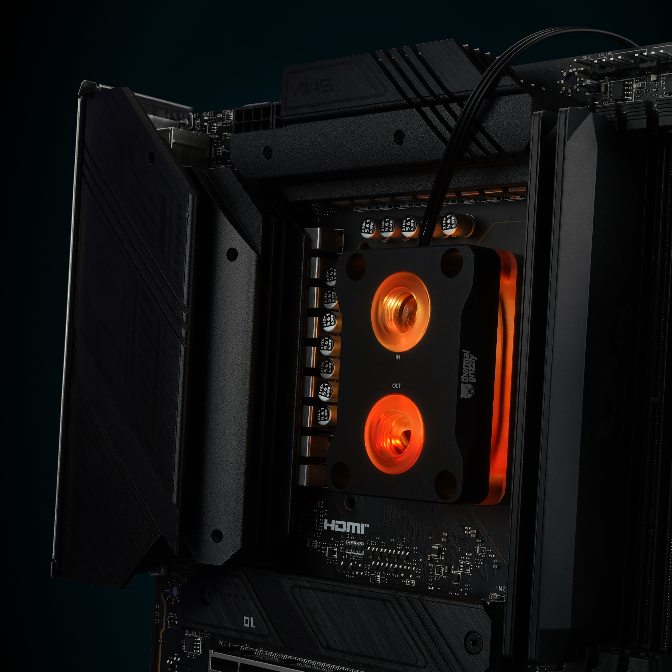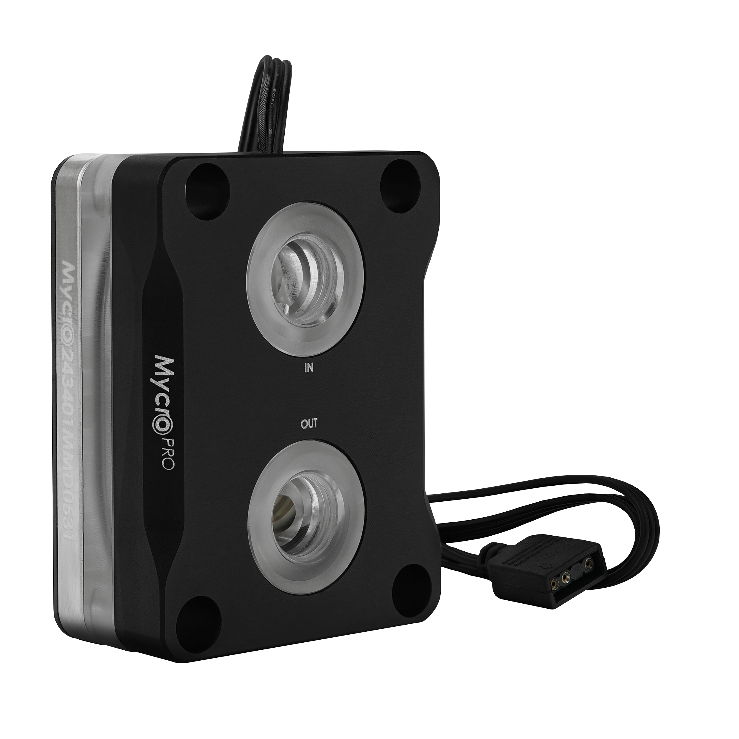 Zwischen der Coldplate und dem Deckel aus eloxiertem Aluminium befindet sich Acyrlglas, das nach dem Fräsen einem Temperprozess unterzogen wird, welcher das Acrylglas von inneren Spannungen befreit. Dadurch kann sichergestellt werden, dass sich auch nach einer langen Nutzungsdauer keine Spannungsrisse im Acrylglas bilden, wie es bei gehärtetem Acrylglas vorkommen kann. Unter dem Alu-Deckel befinden sich RGB-LEDs, die via 3-Pin-ARGB-Header (+5V/DATA/GND) über das Mainboard gesteuert werden. Die LEDs beleuchten das Acrylglas unter dem Deckel und die G1/4-Zoll-Anschlüsse im Deckel.